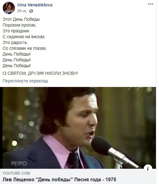 9 травня на своїй сторінці у Facebook вона опублікувала відео "день победы" з громадянином РФ Левом Лещенком - прихильником окупації Росією Криму, довіреною особою президента РФ Путіна.