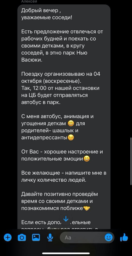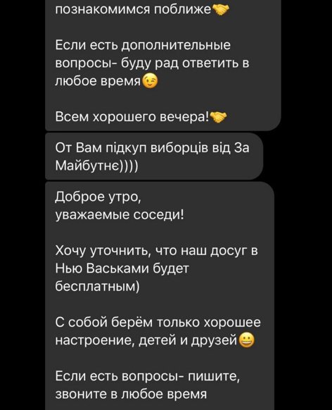 У повідомленні дорослим обіцяли шашлик та "антидепресанти", а дітям – аніматорів та пригощання. Пропонували зібратись о 12:00 4 жовтня на зупинці громадського транспорту, щоб доїхати безкоштовним автобусом.