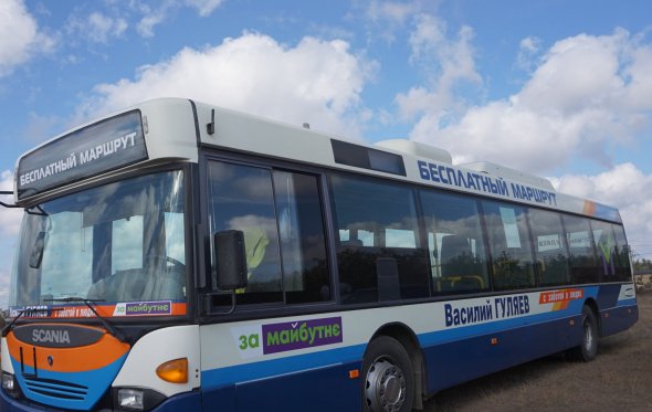 Того ж дня спостерігач біля входу до етнопарку виявив автобус з написами: "Бесплатный маршрут. За майбутнє. Василий Гуляев с заботой о людях". А біля входу – натовп людей з дітьми.