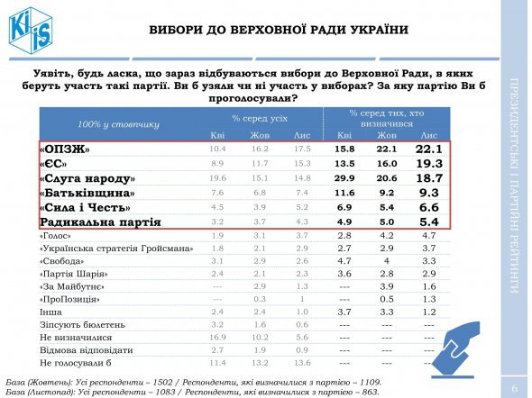 Якби парламентські вибори проходили на початку листопада 2020 року, до Верховної Ради потрапили б 6 партій. Найвищі шанси подолати 5-відсотковий бар'єр мають "Опозиційна платформа - за життя", "Європейська солідарність", "Слуга народу", "Батьківщина", "Сила і честь" і Радикальна партія.