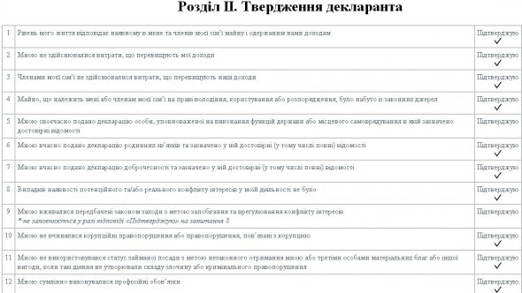 У іншій декларації доброчесності підтверджують, до прикладу, що "не здійснюють витрати, що перевищують доходи".
