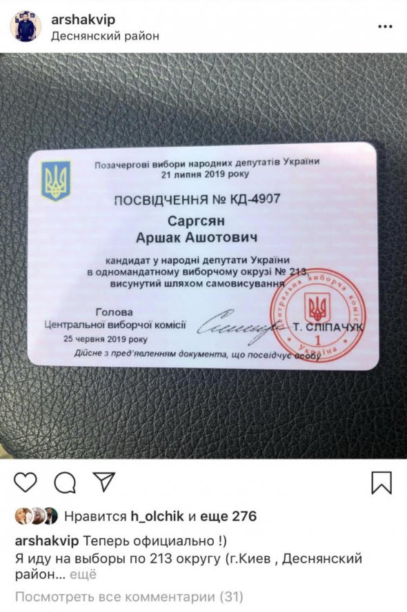 Молодий столичний ресторатор і бізнесмен Aршак Саргсян балотується до Верховної Ради. Про це він повідомив в соціальних мережах, опублікувавши фото посвідчення кандидата в народні депутати України. Безпартійний самовисуванець буде боротися за місце в парламенті по одномандатному виборчому округу №213 в Києві, де очікується гостра боротьба за голоси електорату.