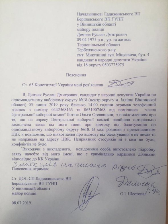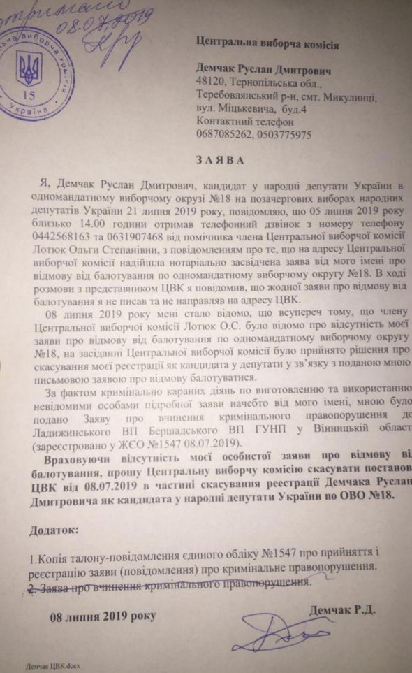 Згідно з документами, переданими кандидатом, 5 липня з ним зв'язався член Центральної виборчої комісії Ольга Лотюк, яка повідомила про отримання ЦВК від його імені нотаріально посвідченої заяви про відмову балотуватися по одномандатному виборчому округу №18.