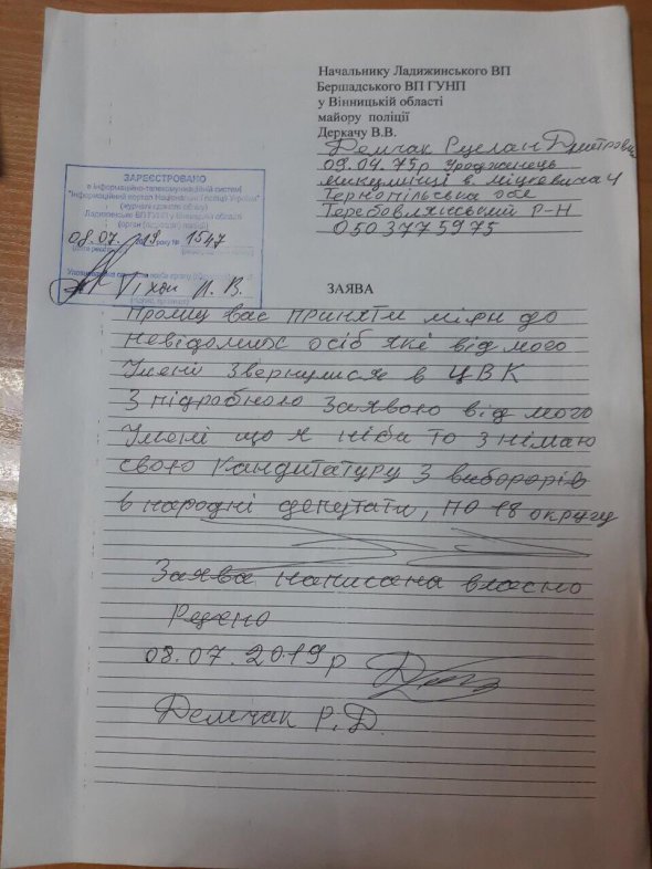 На даний момент, Русланом Демчаком подані відповідні пояснення в ЦВК, а також заява у Ладижинське відділення поліції ОП Бершадського ОП ГУНП у Вінницькій області за фактом підробки документів і їх подачі від його імені.