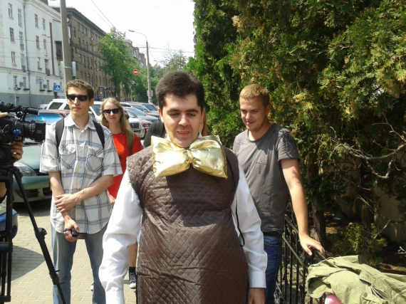 Молоді люди розгортають плакати та стають під дверима офісу. На великих ватманах написано: "Навіщо опозиції брехливий мер?", "Порошенко змінює погляди, як обгортки", "Щоб отримати посаду, слід підмазать шоколадом", "Опозиція продалася за шоколадку?" тощо.