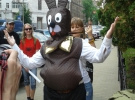 Одна дівчина починає одягати іншого активіста у коричневий костюм кролика. На шиї у нього — великий золотистий бант, на голові — тканева маска з вухами і сіточками на місці очей, на руках — коричневі рукавички. На спині — прикріплений папірець із написом "Хочу бути мером".