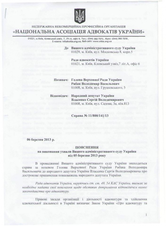 "В зв'язку із тим, що попередні фото були не дуже якісні, повторно публікую позицію НААУ у моїй справі про позбавлення мене мандату. Ця позиція була взята за основу судом. При цьому хочу нагадати, що починаючи з березня 2008 року, я не був адвокатом (пп.1 п.1 ст.1 закону "про адвокатуру та адвокатську діяльність" адвокат-фізична особа, яка ЗДІЙСНЮЄ АДВОКАТСЬКУ ДІЯЛЬНІСТЬ). При цьому навіть в цьому документі НААУ зазначено, що я не підтверджував відомості щодо мене в реєстрі, то на якій підставі вони (НААУ) внесли ці відомості до цього реєстру? При цьому, ще раз звертаю увагу, що Закон України "Про адвокатуру та адвокатську діяльність" розповсюджується лише на адвокатів ( яким я з 2008 року НЕ БУВ). Ще один момент, якщо я порушив Закон "Про адвокатуру", то чому мене покарали згідно із Законом "Про статус нардепа"?