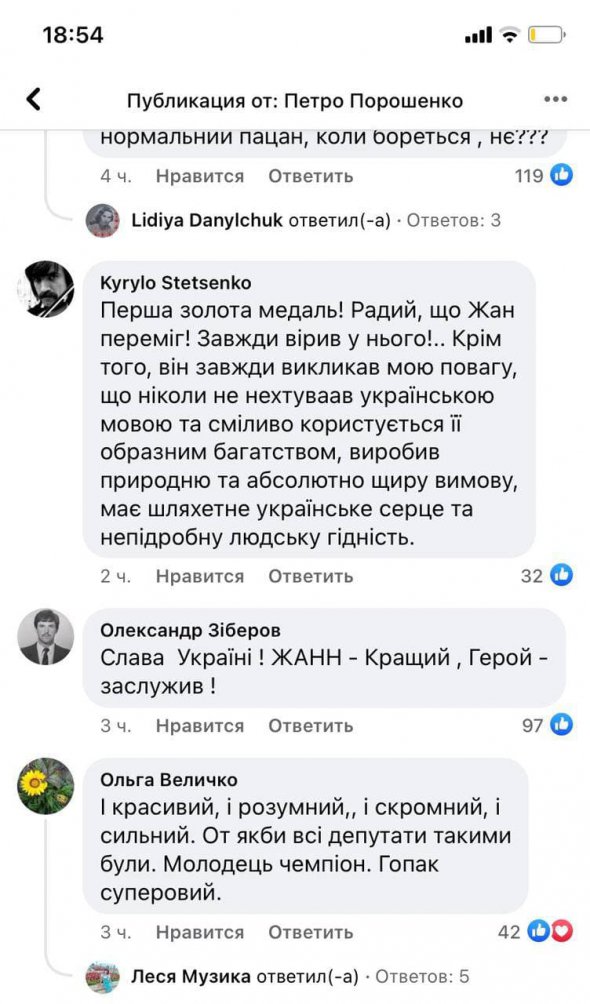 "Перша золота медаль! Радий, що Жан переміг! Завжди вірив у нього!.. Крім того, він завжди викликав мою повагу, що ніколи не нехтував українською мовою та сміливо користується її образним багатством, виробив природню та абсолютно щиру вимову, має шляхетне українське серце та непідробну людську гідність", - зазначив Kyrylo Stetsenko.