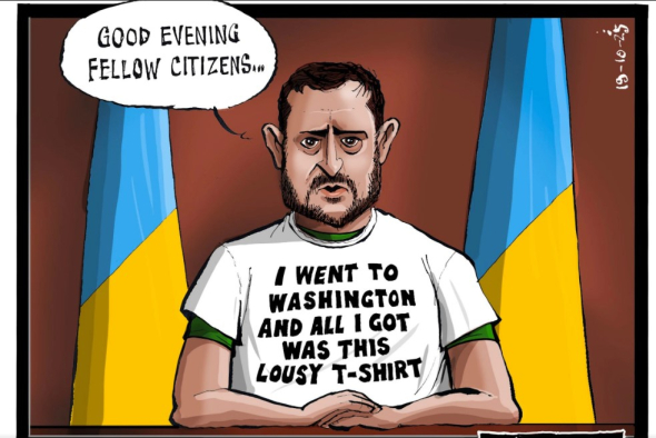 На малюнку було зображено українського лідера. На ньому - біла футболка з саркастичним написом: "Я їздив до Вашингтона, і все, що я отримав - ця паршива футболка".