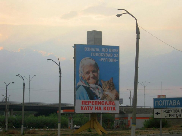 У Дніпродзержинську з'явились бігборди із зображенням бабусі та написом "Взнала, що внук голосував за "Регіони" - переписала хату на кота".