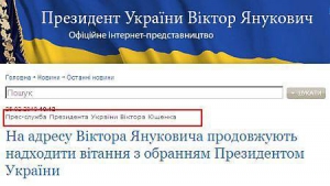 У так званій "шапці" сайту тепер написано "Президент України Віктор Янукович", однак перше ж повідомлення про нового президента досі підписано "прес-служба президента Віктора Ющенка".