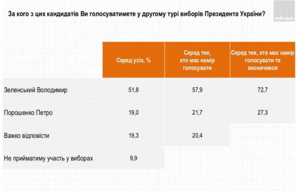 Майже 73% українців із тих, хто визначився і має намір голосувати, готові підтримати шоумена Володимира Зеленського, за чинного президента Петра Порошенка готові проголосувати 27% виборців. Про це свідчать результати опитування соціологічної групи "Рейтинг" із 12 до 16 квітня.