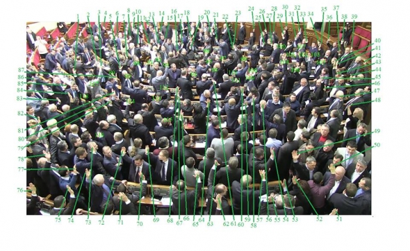 "Цей стоп-кадр чітко фіксує, що за законопроект по введенню диктатури проголосувало 118-120 депутатів. Припускаю, що ще десяток-два просто не влізли у кадр (параметри провладних депутушок самі знаєте які, не кожна камера схопить). Ну ще пару могли настільки блискавично голосувати, що тільки Олійник міг це помітити. Це ж не жарт - за 3-5 секунд, а саме стільки тривало голосування порахувати в такому натовпі всі ці руки. Але де там набралося 235 чи за даними сайту ВРУ 239?
