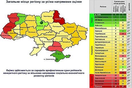 У той же час, лідерами щодо соціально-економічного розвитку за перше півріччя 2013 року стали: Київ - 1-е місце, Севастополь - 2-е місце Крим - 3-е місце, Рівненська область - 4-е місце, Київська область - 5-е місце.