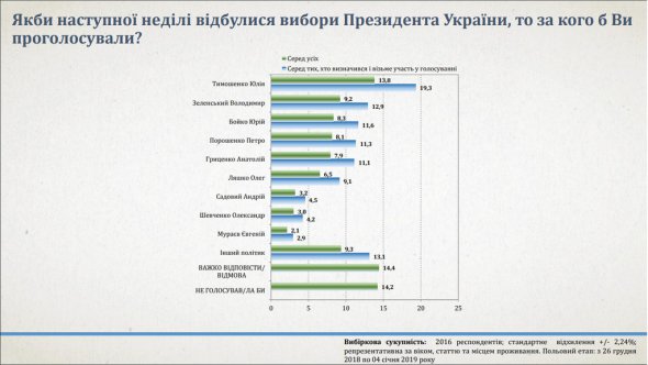 На другій позиції — артист і шоумен Володимир Зеленський. За нього готові віддати свої голоси 12,9% українців. За лідера "Опозиційної платформи "За життя" Юрія Бойка — 11,6%, президента Петра Порошенка — 11,3%, лідера партії "Громадянська позиція" Анатолія Гриценка — 11,1%, лідера Радикальної партії Олега Ляшка — 9,1 %, мера Львова Андрія Садового — 4,5%, народного депутата Олександра Шевченка — 4,2% і главу партії "Наші" Євгенія Мураєва — 2,9%.