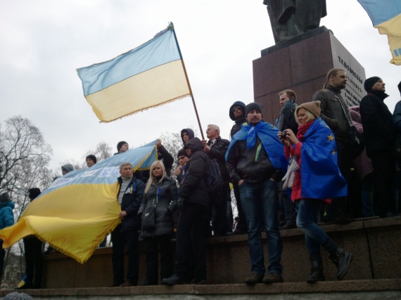 Вся площа навколо пам`ятника вщент заповнена людьми. Також вони стоять на тротуарах та на протилежних вулицях час від часу співають гімн України. Мітингувальники розповідають, що прийшли в знак протесту проти розгону Майдану.