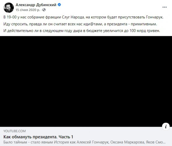 Запис з YouTube, зараз недоступний. - Gazeta.ua, запостив того дня ввечері у Facebook народний депутат від "Слуга народу" Олександр Дубінський.