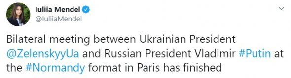 "Двостороння зустріч президента України Володимира Зеленського та президент Росії Володимира Путіна у рамках "нормандського формату" у Парижі завершилася", - написала вона.
