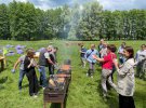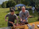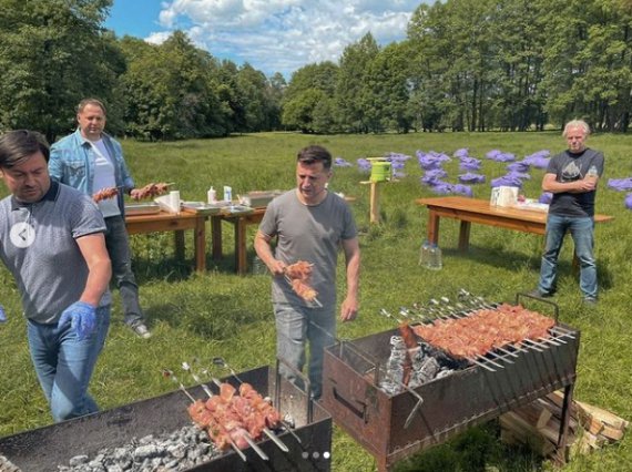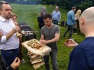 На фото Зеленський робить шашлик, позаду м'ясо на шампурах підносить керівник Офісу президента Андрій Єрмак. На галявині поставили мангали, намет.