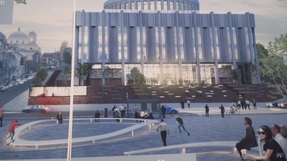 Зеленському показали проект перебудови Українського дому на Європейській площі. Там можуть зʼявитися доступні для всіх коворкінг, кавʼярні, а біля будівлі — фонтан. Свій кабінет Зеленський хоче із виглядом на Європейську площу, пише theБабель