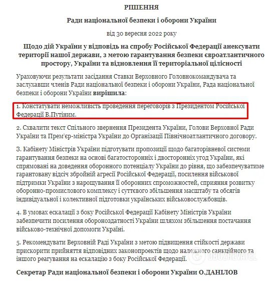 Перший пункт рішення РНБО, який підписав президент Володимир Зеленський, передбачає "констатувати неможливість переговорів із Володимиром Путіним"
