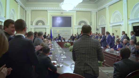На відео показано, як президент приходить на засідання фракції "Слуга народу". Йому стоячи аплодують.