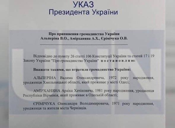 Президент Володимир Зеленський припинив громадянство України для Вадима Альперіна та Олександра Єрімічука, проти яких Рада національної безпеки і оборони запровадила санкції. Також припинив громадянство Араіка Амірханяна.