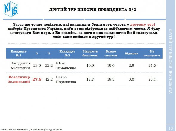 Зеленський посідає друге місце. На першому – Юлія Тимошенко (21,2%). Петро Порошенко займає третю позицію з 11,6% підтримки. На четвертому місці – Юрій Бойко (11%). У Олега Ляшка п'яте місце (8,7%), у Анатолія Гриценка – лише шосте (8,2%). У другому турі Володимир Зеленський перемагає своїх найближчих опонентів – і Петра Порошенка, і Юлію Тимошенко. Причому у чинного президента він виграє понад 15% – 27,8% проти 12,2%.