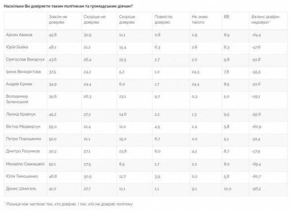 Баланс довіри й недовіри найкращий у Разумкова (-27,5) та Зеленського (-29,1), найгірший в Авакова (-64,4) та Саакашвілі (-69,4).