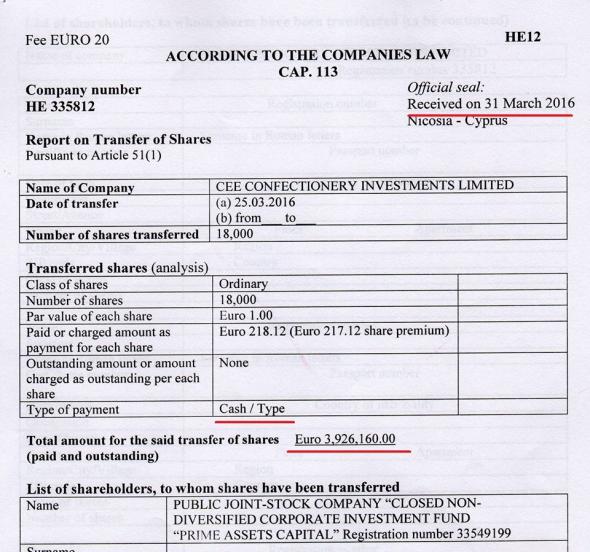 "В офіційній формі про акціонерний капітал йдеться, що за тиждень до виходу нашого першого розслідування, 25 березня 2016 року, український фонд "Прайм Ессет Капітал" (власник - Петро Порошенко) перерахував за акції 3,926 млн євро кіпрській компанії CEE Confectionery Investments Ltd. (кінцевий бенефіціар - Петро Порошенко). У графі "тип платежу" написано "кеш". Тобто українська фірма Порошенка купила майже за 4 млн євро 18 тисяч акцій його ж кіпрської компаніїї. Остання, нагадаю, на той час належала його віргінській фірмі, власником якої й був Порошенко (коло замкнулося)", - написав Гнап.