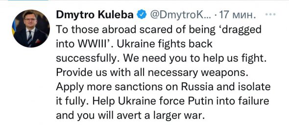 "Тим, хто за кордоном боїться, що їх "втягнуть у Третю світову війну". Україна успішно чинить опір. Нам потрібно, щоб ви допомогли нам боротися. Забезпечте нас усім необхідним. Введіть більше санкцій проти Росії, щоб її повністю ізолювати. Допоможіть Україні змусити Путіна зазнати невдачі, і ви відвернете велику війну", - написав.