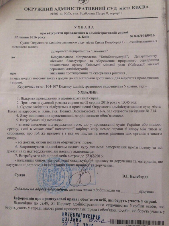 Зазначають, що позов подали 12 липня. Рішення суд прийняв у найкоротші терміни. Призначив розгляд позову до КП "Благоустрій", Департаменту міського благоустрою та збереження природного середовища Київської міськдержадміністрації на 2 серпня о 13:45.