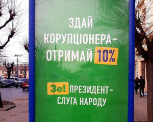 "Здай корупціонера - отримай 10%" - сповіщали передвиборчі агітаційні плакати Володимира Зеленського навесні 2019 року.