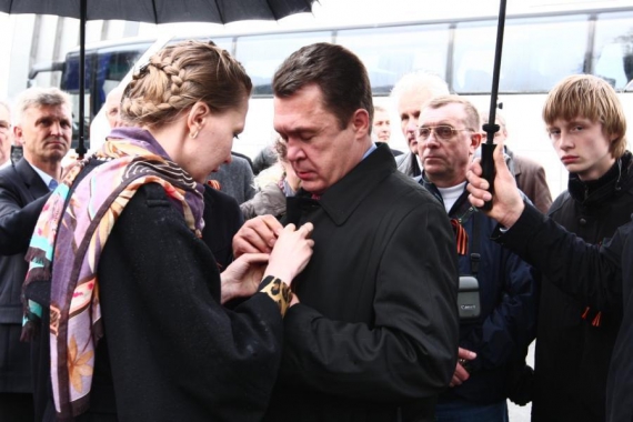 "Ми не дарма зібралися біля арки Дружби народів. Мій бойовий шлях пройшов від селища Понирі на Курськ і завершився біля Праги. Я брав участь у звільненні семи областей України. У моїй артилерійській батареї були представники 9-ти національностей. Чи не є це уособленням єдності народів Радянського Союзу? Зараз виникли нові виклики людству, народам і державам. Це екстремізм, тероризм і радикальний націоналізм. Розпад Радянського Союзу показав не лише позитивні, а й негативні сторони цієї події. Останнє десятиліття правління помаранчевих - це і вихвалення посібників фашизму, і русофобія, і намагання віддалити наші народи. Але це у них не вийде", - заявив зі сцени ветеран ВВВ генерал-майор Григорій Михайлович Марат.