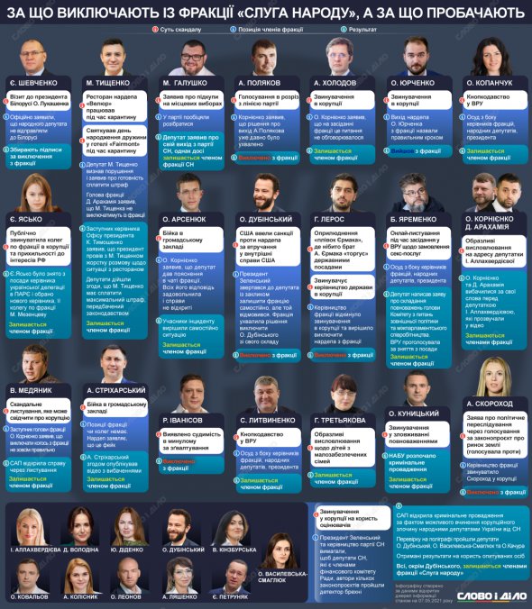 Фракція "Слуга народу" з серпня 2019 року виключила зі своїх лав шістьох депутатів, незважаючи на те, що для монобільшості важливий кожен голос. Інфографіку, кого і за що виганяли з фракції, а також хто з нардепів уникнув виключення, попри скандали, опублікував портал "Слово і діло"