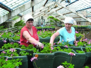Працівниці комунального підприємства "Декоративні культури" Валентина Мілка (ліворуч) і Ольга Рева в теплиці пересаджують квіти з горщиків у великі вазони. Наступного тижня зелень винесуть на центральні вулиці міста. Загалом близько 370 вазонів. Торік квіти у Полтаві висадили ще на початку травня.