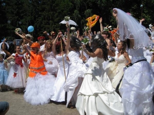 Майже 200 жінок та дівчат у весільних сукнях танцюють молодіжний танок "Харлем Шейк" під час параду наречених в Полтаві 26 травня. Двоє натягли на голову пакети для сміття. У першому ряду вихиляє стегнами дівчина в корсеті й короткій балетній пачці. Поруч пританцьовує 75-річна Софія Демченко. Після танцю її проголошують найстарішою нареченою, вручають сертифікат на безкоштовну поїздку лімузином.