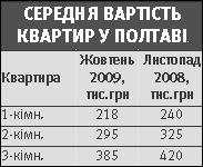 У Полтаві за останній рік через фінансову кризу ціни на квартири впали на 10%. Найбільше поступаються під час продажу три- і чотирикімнатних помешкань. Вартість указують у доларах, тож у цій валюті ціни дійсно впали. Проте курс гривні до долара виріс у півтора раза, і в гривневому еквіваленті ціна суттєво не змінилася.