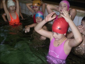 Медсестра басейну Зінаїда Кадуріна пояснює, температура води в басейні повинна бути +31°С, повітря +24–25°С. Плавання корисне, бо у воді працюють усі м"язи, покращується кровообіг, розвивається правильне дихання.
