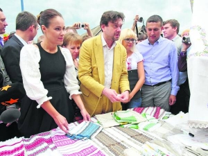 — Яка цікава вишивка, — Остап Ступка спиняється біля ятки з рушниками. Наталія Королевська та Андрій Шевченко розглядають крам.