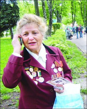 — Толечку! Я радий тебе привітати з Днем Перемоги, — говорить у слухавку фронтовик Володимир Шишлянніков. Він телефонує до Ульяновська в Росію рідним, які були учасниками бойових дій. — Бажаю міцного здоров"я, успіхів. Радий, що додзвонився до вас прямо із площі, де йде святкування Перемоги в Полтаві. Щастя Вам, рідні, на довгі роки! — закінчує розмову. — Ой дівчата, я готовий вас розцілувати за дзвінок, — звертається до представниць "Київстару". Цілує їх.