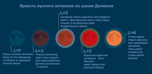 Під час повного затемнення Місяць стає темно-червоним. Його ще називають кривавим. Такий колір зумовлений слабким світлом, яке розсіюється крізь атмосферу Землі. Для оцінки яскравості супутника Землі використовують шкалу Данджона - від нуля до чотирьох. Так, нуль - означає дуже темне затемнення. Чотири - мідно-червоний або оранжевий колір.