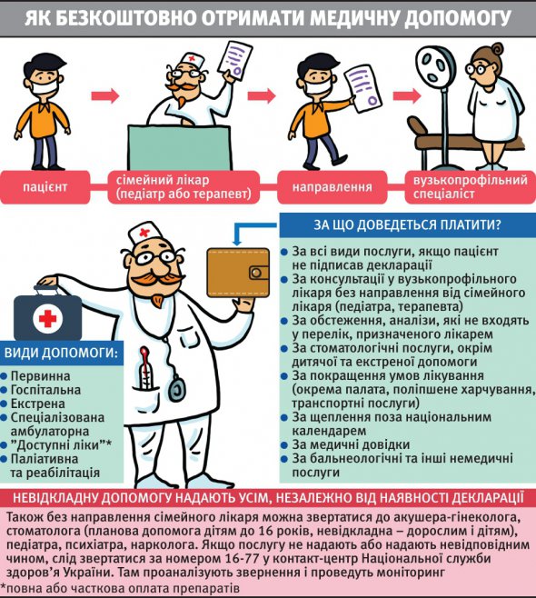 НЕВІДКЛАДНА ДОПОМОГА НАДАЄТЬСЯ ВСІМ, НЕЗАЛЕЖНО ВІД НАЯВНОСТІ ДЕКЛАРАЦІЇ. Також без направлення сімейного лікаря можна звертатися до акушера-гінеколога, стоматолога (планова допомога дітям до 16 років, невідкладна — дорослим і дітям), педіатра, психіатра, нарколога.