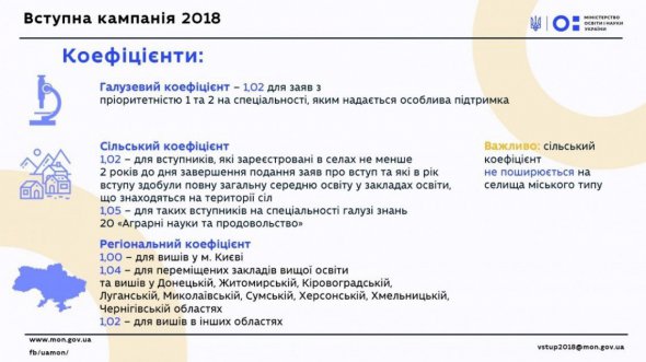 У цьогорічній вступній кампанії залишили коефіцієнти. Сільський коефіцієнт на аграрні спеціальності збільшили з 1,02 до 1,05. Галузевий - 1,02, поширюється на заяву з першою і другою пріоритетністю.
