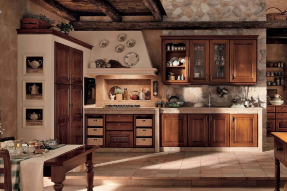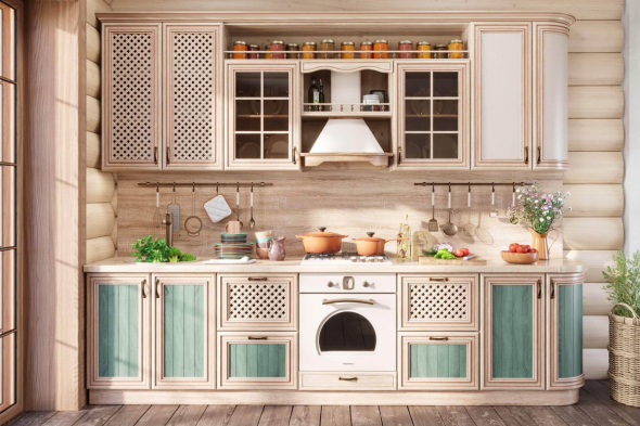 Кухонний гарнітур найкраще купувати в природних відтінках, оздоблений стилізованим різьбленням або фрезеруванням. Відмінно підійде модульна кухня із великою кількістю навісних ящиків.