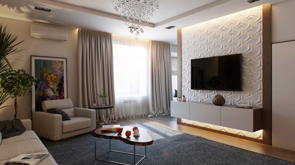 Стіна з телевізором: акцент можна зробити на стіні, де розміщується телевізор. Виберіть стильні облицювання або створіть нішу для телевізора, використовуючи декоративні елементи чи спеціальне освітлення.