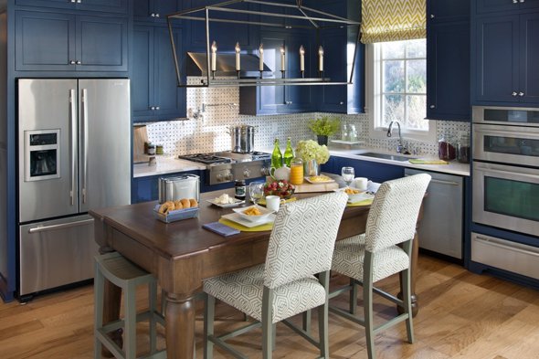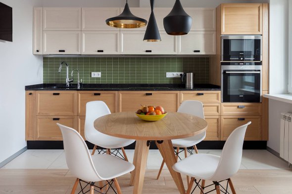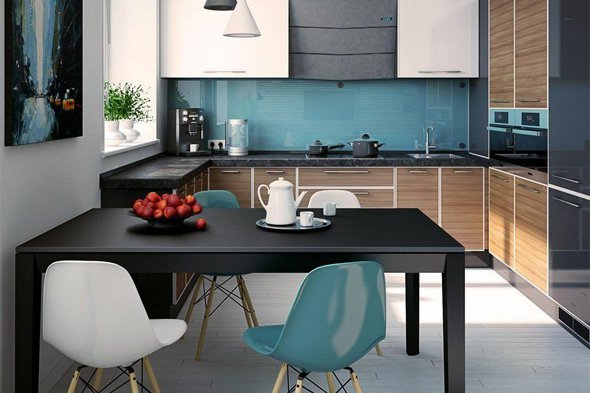Залишивши мінімум 1,2 м для проходу між двома рядами шаф, ми отримуємо достатньо місця для обіднього столу шириною 0,6 м і стільців навколо нього. Дизайнери пропонують такі варіанти розміщення обідньої зони:
