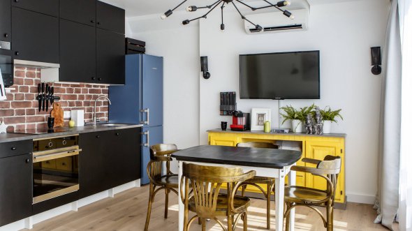 Ф'южн не обмежується тільки стилями меблів та декором. Ви також можете поєднувати різні технології, які допоможуть створити унікальний інтер'єр. Наприклад, інтер'єр з елементами старовини та сучасних гаджетів чи домашніх роботів. Оберіть дзеркало з вінтажною рамкою, доповніть концепцію функціональним ліжком з підйомним механізмом. Експериментуйте!