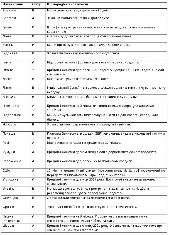 Міжнародний фінансовий портал Financer.com вивчав ситуацію з кредитами в 26 країнах світу, на ринках яких він представлений. В таблиці можна порівняти, які країни оголосили кредитні канікули через карантин, а які обмежились рекомендаціями для банків домовлятись з клієнтами, хто надає найдовші і найвигідніші відстрочки за кредитами для бізнесу і споживчими кредитами для населення.