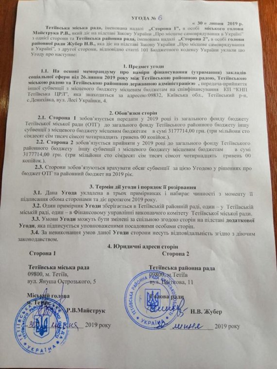 Відповідно до договору міський голова Руслан Майструк зобов'язується передати 2019 року із загального бюджету Тетіївської ОТГ до загального фонду Тетіївського районного бюджету 3 177 714 грн. Гроші направлять на фінансування Тетіївської ЦРЛ.